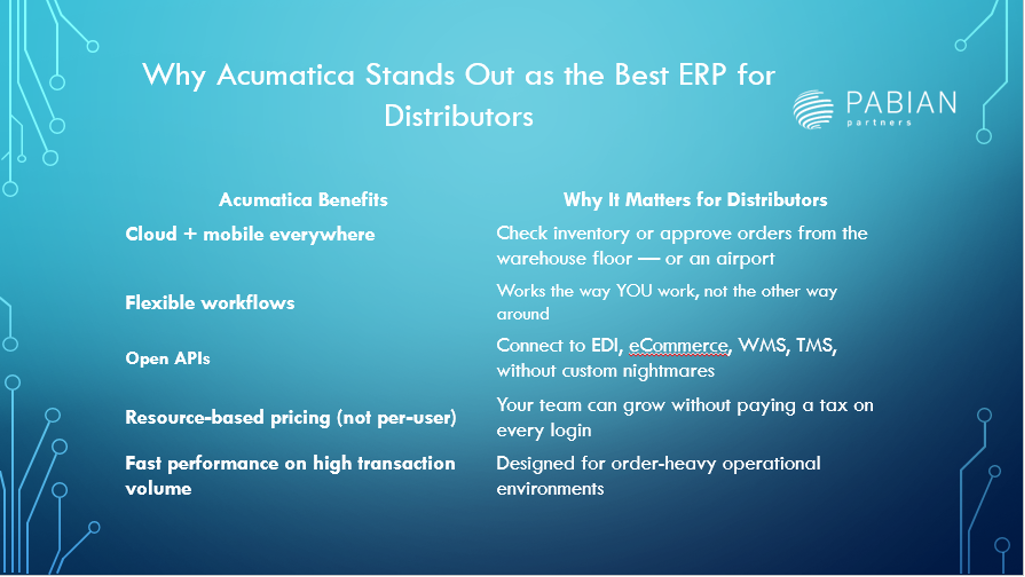 That’s where ERP software for distributors changes the game. Modern platforms like Acumatica (and the right implementation partner Pabian Partners) give distributors real-time visibility, automation, and the agility needed to grow without chaos.